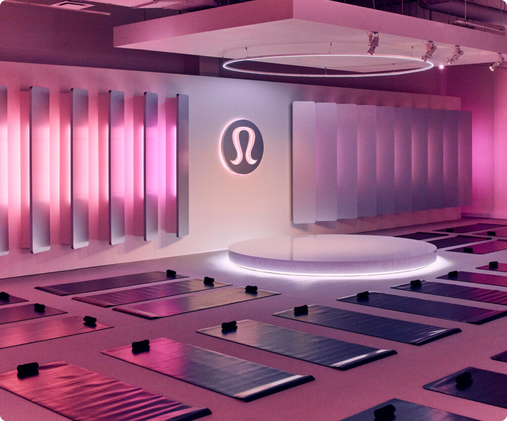 We partnered with Pinch to create lululemon’s GlowUp Studio, a fully immersive, high-energy environment that blended movement, community, and brand expression. From the vibrant pink exterior window that drew guests into the space, to the dynamic check-in area that set the tone, each touchpoint was intentionally crafted to enhance the experience.