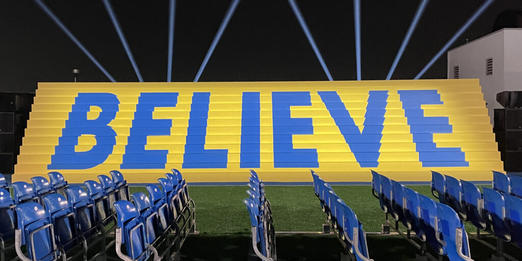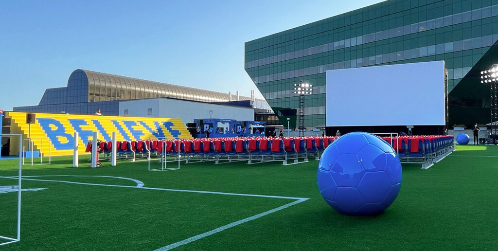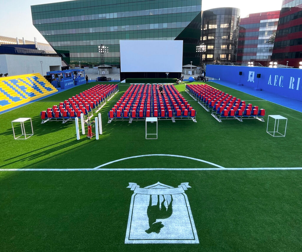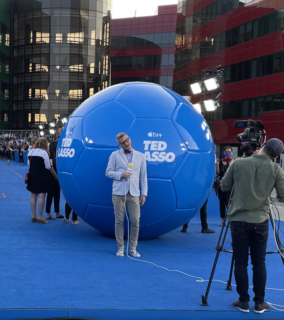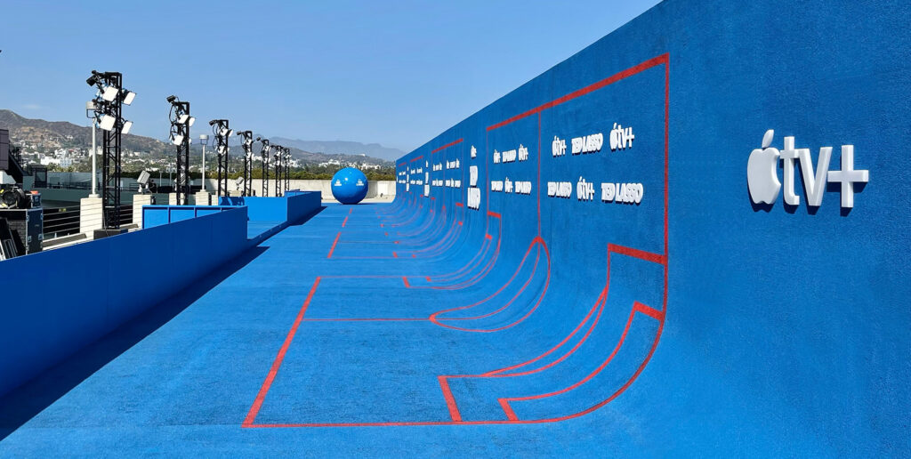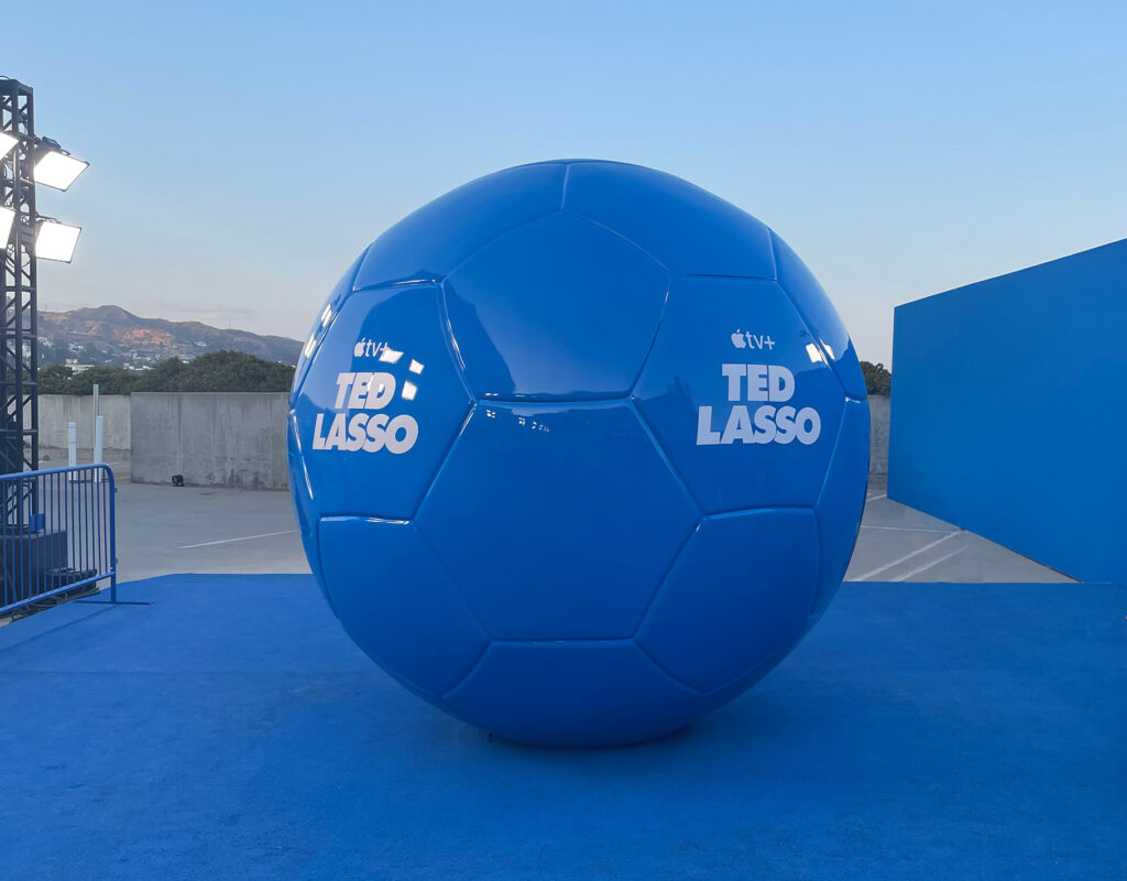 For the season 2 premiere, we transformed L.A.’s Pacific Design Center rooftop with a 216-foot blue turf carpet and soccer pitch with stadium seating, lights, a projection screen, and concession stands. A highlight of the environment was an 8-foot custom-built soccer ball—a photo-worthy element. The screening was followed by a celebration at nearby Italian restaurant Cecconi’s—completely overhauled to feel like a pub in London—where guests enjoyed bites and beverages as the tunes of Marcus Mumford and other tracks from the hit series played. In addition to the Ted Lasso cast, Apple CEO Tim Cook and the mayor of Los Angeles were seen kicking it on our rooftop soccer pitch.